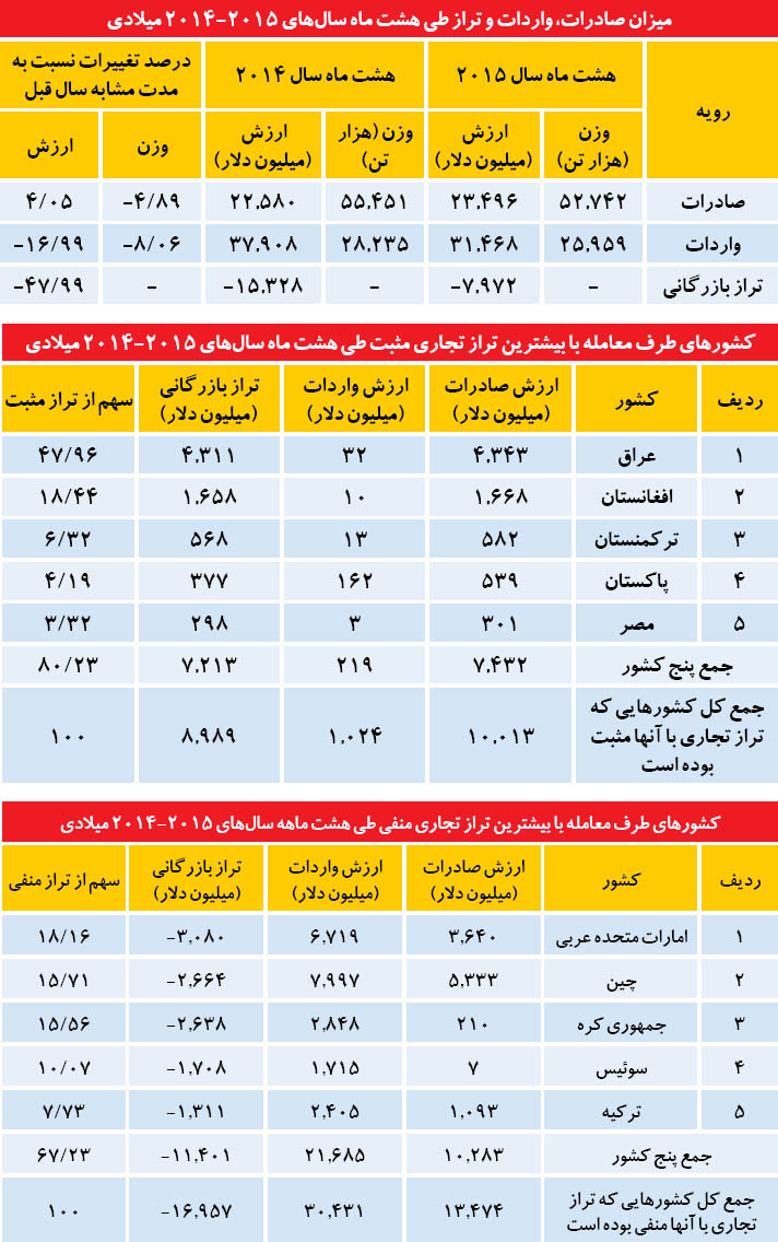 بر اساس آمارهای گمرک، طی هشت ماه منتهی به آگوست سال جاری میلادی، ارزش صادرات کشور با رشد بیش از 4درصدی نسبت به دوره مشابه سال گذشته، به 23 میلیارد و 496 میلیون دلار رسیده، اما واردات کشور به لحاظ ارزشی با افت حدود 17 درصدی همراه بوده و معادل 31میلیارد و 468 میلیون دلار رقم خورده است. تراز بازرگانی کشور نیز طی این مدت معادل منفی هفت میلیارد و 972 میلیون دلار ثبت شده است، در حالی که در مدت مشابه سال 2014 میلادی این رقم معادل منفی 15 میلیارد و 328 میلیون دلار بود. رشد حدود 4 درصدی ارزش صادرات کشور طی این مدت در حالی است که بررسی صادرات کشور از ژانویه تا آگوست سال جاری میلادی از افت پنج درصدی ارزش صادرات کشور در ماه آگوست نسبت به ماه جولای حکایت دارد. واردات کشور در ماه آگوست نیز افت ارزشی 16 درصدی را نسبت به ماه قبل تجربه کرده است.