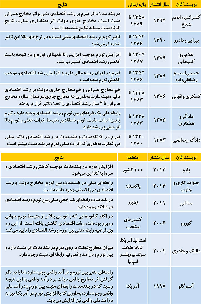 این تحقیق به برخی از مطالعاتی که پیش از این در ایران برای بررسی ارتباط بین تورم و رشد اقتصادی و همچنین ارتباط بین مخارج دولت و رشد اقتصادی انجام شده است نیز اشاره کرده و چکیده این مطالعات را ارائه داده است. پیرایی و دادور (1390) در تحقیق خود بر اساس دادههای 1353 تا 1386 و با استفاده از مدل «واریانس ناهمسانی شرطی خودرگرسیو تعمیمیافته» به این نتیجه رسیدند که تاثیر تورم بر رشد اقتصادی منفی است؛ بهطوریکه برای تورم کمتر از 20 درصد این تاثیر کمترین مقدار را دارد و در نرخ های بالاتر این تاثیر افزایش مییابد.
