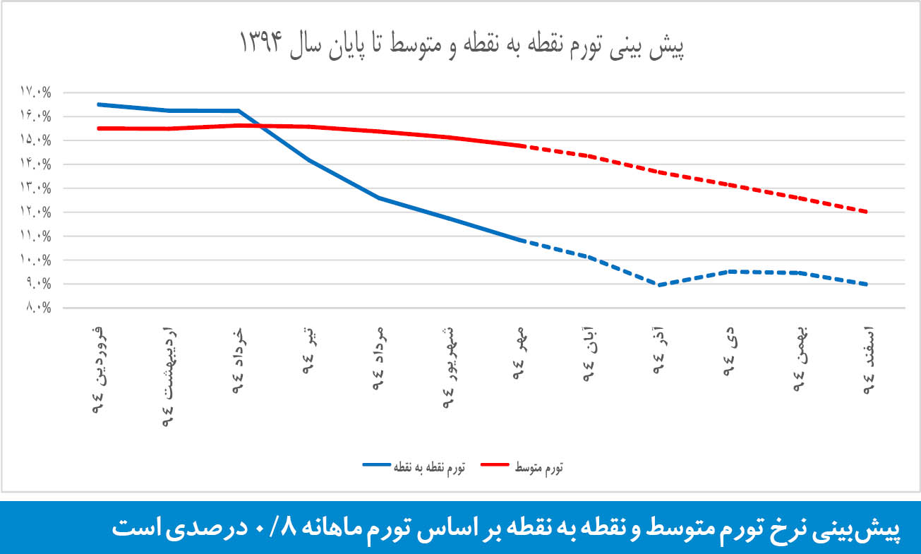 تورم نقطه به نقطه، تغییرات شاخص بهای مصرفکننده را در یک ماه مشخص نسبت به ماه مشابه سال قبل در نظر میگیرد. با فرض تورم ماهانه 0/8 درصدی در آبان ماه تورم نقطه به نقطه به 10/1 درصد و در آذر ماه معادل 8/9 درصد و تکرقمی خواهد شد. این روند با کمی نوسان تا انتهای سال جاری تداوم خواهد داشت و در اسفند ماه، میزان تورم تکرقمی معادل 9درصد ثبت خواهد شد. بنابراین مطابق آمارها تورم ماهانه 0/8 درصدی تا پایان سال حصول تورم تکرقمی نقطه به نقطه را تضمین خواهد کرد.
