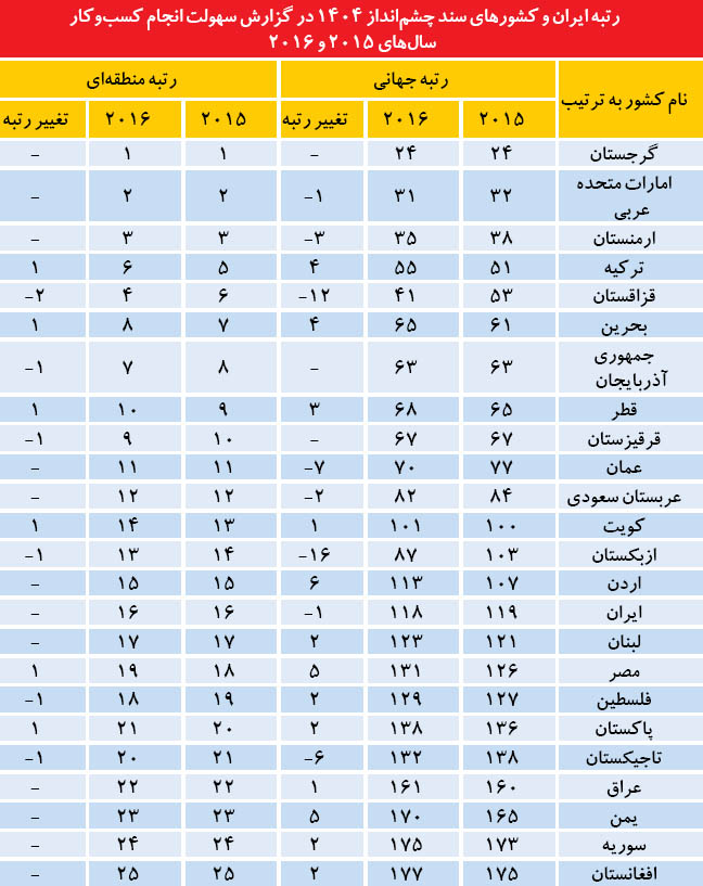 بازوی پژوهشی مجلس با بررسی جایگاه منطقهای ایران و کشورهای موضوع سند چشمانداز 1404 در گزارش سهولت انجام کسبوکار اعلام کرد: رتبه ایران در سال 2016 میلادی نسبت به سال 2015 میلادی تغییری نداشته و همچنان در رتبه 16 از میان 25 کشور باقیمانده است. این امر نشان میدهد که به منظور ارتقای جایگاه منطقهای ایران، به اصلاحات بیشتری در زمینه محیط کسبوکار نیاز است.