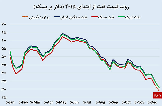 با افت قیمت سبد نفتی اوپک به مرز 30 دلار برآورد میشود که قیمت نفت سنگین ایران به کمتر از 30 دلار و حتی به محدوده 28 دلار به ازای هر بشکه رسیده باشد.