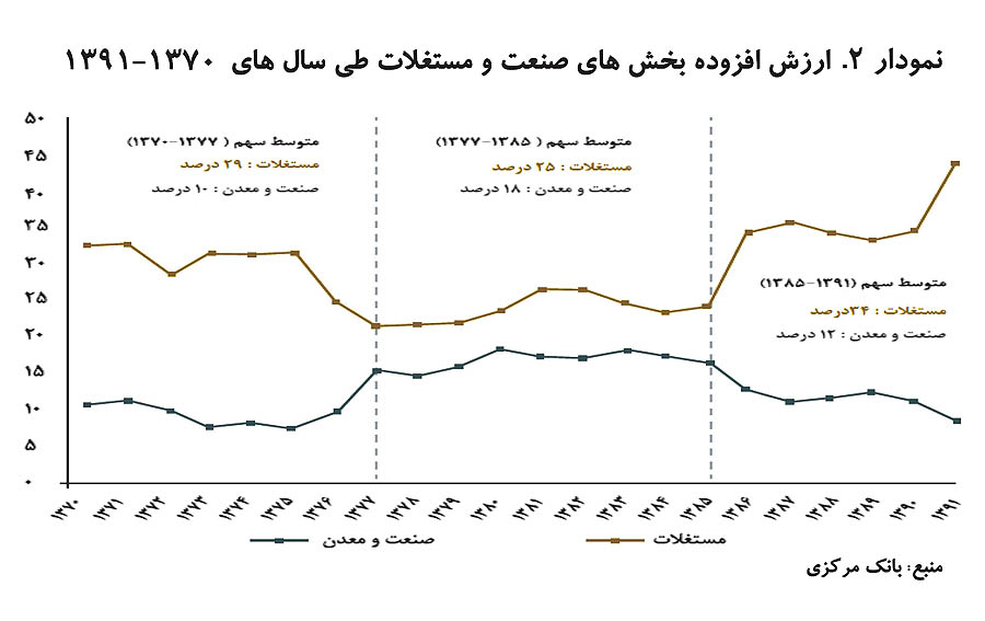 دوم اینکه، افزایش قیمت نسبی مستغلات، بهطور کلی، به معنای افزایش نسبی ارزش دارایی دارندگان مستغلات و در نتیجه بازدهی نسبی آن است. یعنی، این افزایش قیمت، بهطور کلی، موجب تغییر توزیع درآمد به نفع دارندگان دارایی ارضی شده است. سوم اینکه، بخش مستغلات را به موتور مکنده جذب نقدینگی در کلانشهرها تبدیل کرده است. به بیانی دیگر، رشد بیش از اندازه قیمت مستغلات موجب بازدهی بالاتر آن در کلانشهرها در مقایسه با سایر فعالیتهای اقتصادی شده است. در نتیجه، بخشی از نقدینگی که میتوانست در بخشهای صنعت و کشاورزی و حمل و نقل جذب بشود و به افزایش ظرفیتهای تولیدی و اشتعالزایی و رشد صادرات در این بخشها بینجامد، سر از مستغلات درآورده است. همانطور که دادههای ارزش افزوده بخشی به قیمت ثابت سال 1376 نشان میدهد، سهم ارزش افزوده بخش مستغلات طی سالهای 1370 به بعد از کل ارزش افزوده همیشه بیشتر از سهم ارزش افزوده بخش صنعت و معدن بوده است. میانگین سهم این دو، به ترتیب، در دوره 1377-1370 برابر 29 و 10 درصد و در دوره 1385-1377 برابر 25 و 18 درصد بوده است.