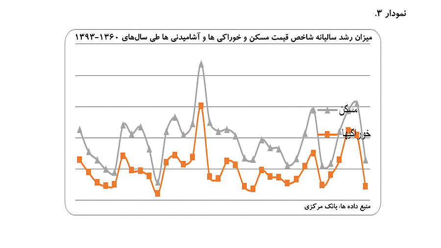 چهارم اینکه، از طریق سازوکار شاخصبندی، موجب افزایش سایر قیمتها شده است. با توجه به متوسط وزن 35 درصدی قیمت مسکن در کل شاخص هزینه زندگی، این افزایش به معنای افزایش هزینه زندگی است که موجب افزایش دستمزدها، هزینه تولید و در تحلیل نهایی افزایش قیمت سایر کالاها شده است. در عین حال، رشد سریعتر قیمت مسکن در مقایسه با قیمت سایر کالاها (نمودار 3) به معنای کاهش نرخ واقعی ارز و در نتیجه کاهش مزیت رقابتی در عرصه صادرات کالاهای قابل مبادله صنعتی و کشاورزی و در تحلیل نهایی محدودسازی ظرفیتهای تولیدی این بخشها است.(یکی از شاخصهای نرخ واقعی ارز، نسبت قیمت کالاهای قابل مبادله به کالای غیر قابل مبادله (مستغلات) است. هر چه میزان رشد شاخص قیمت مستغلات نسبت به قیمت سایر کالاها بیشتر باشد به معنای کاهش نرخ واقعی ارز است.)