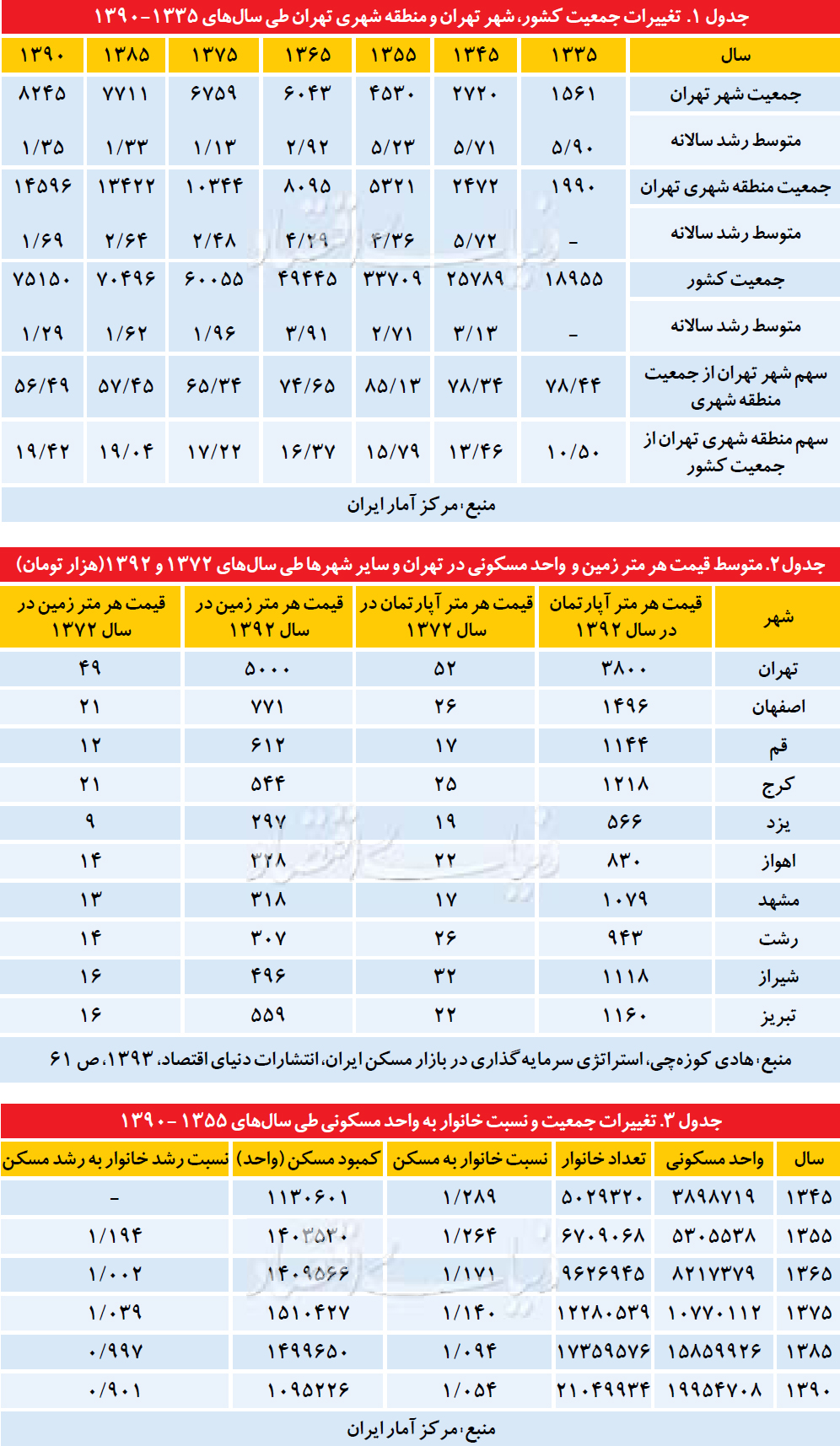 اگر در تحلیل ریکاردویی انفجار طبیعی جمعیت در اوایل قرن نوزدهم موجب شکلگیری رانت مستغلاتی و پیامدهای منفی مذکور آن در بلندمدت میشد، در اقتصاد ایران، فرمولهسازی نادرست سیاست توسعه مسکن شهری به همراه سیاست تشویقی جمعیت در دهه 1360، موجب رشد بیش از اندازه سرمایه مستغلاتی و تبدیل آن به موتور مکنده جذب سرمایه شده است. افزایش شدید جمعیت کشور از 33 میلیون و 708 هزار نفر در سال 1355 به 60 میلیون و 55 هزار نفر در سال 1375 و 75 میلیون و 149 هزار نفر در سال 1390 (جدول 1)، به همراه گسترش افقی کلانشهرها، به معنای تشدید فشار تقاضا برای زمین و در نتیجه افزایش شدید قیمت زمین و مستغلات بوده است که خود را در آمار به خوبی نشان میدهد. بر مبنای آمار موجود، متوسط قیمت هر متر مربع زمین کلنگی در تهران از 49 هزار تومان در سال 1372 به پنج میلیون تومان در سال 1392 (رشد متوسط سالانه 24/6 درصد) و متوسط قیمت هر متر واحد مسکونی از 52 هزار تومان به 3 میلیون و 800 هزار تومان (رشد متوسط سالانه 7/ 22 درصد) افزایش یافته است (جدول 2). تاثیر چنین سیاستی در بهرهبرداری از زمین و تشدید تقاضا برای آن چنان بوده است که دست کم 6 هزار هکتار از 14 هزار هکتار زمینهای سبز و باغی تهران از سال 1382 به این سو تبدیل به مسکن (برج باغ) شده است. (کارشناسان بخش مسکن از این پدیده بهعنوان «ویروس برج باغ در اراضی سبز» نام میبرند.)