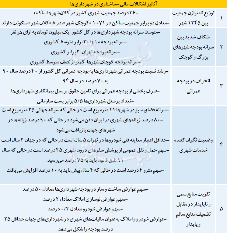 به این ترتیب مشخص میشود معادل دو برابر جمعیتی که در حال حاضر در هزار شهر کشور ساکن هستند فقط در 8 کلانشهر متراکم، اقامت دارند. این عدم توازن جمعیتی بین شهرهای بزرگ و کوچک باعث شده کلانشهرها فراتر از ظرفیت زیستمحیطی و طبیعی خود با رشد جمعیت مواجه باشند. به دنبال این ناهماهنگی در توزیع جمعیت، یک نوع عدم تناسب در توزیع سرانه بودجه شهرداریها نیز اتفاق افتاده است که سبب شده بودجه کلانشهرها به یک نوع ناکارآمدی نیز دچار شوند. تحقیقات علی نوذرپور صاحبنظر حوزه شهری که در تدوین لایحه مدیریت شهری نیز نقش موثری داشته است نشان میدهد به رغم افزایش چشمگیر بودجه عمرانی شهرداریها به بودجه عمرانی کشور به علت تورم هزینههای جاری در شهرداریها منابع مالی در جای درست برای تامین نیازهای حیاتی شهر صرف نشده است. این تحقیقات نشان میدهد نسبت بودجه عمرانی شهرداریها به بودجه عمرانی کل کشور از 40درصد در سال 90 به 70 درصد در سال 94 افزایش پیدا کرده است اما از طرف دیگر شاهد هستیم در بحث خدمات شهری حیاتی موردنیاز در 8 کلانشهر که شامل تامین فضای سبز، بازیافت زباله، وضعیت آلودگی هوا و حملونقل عمومی میشود بودجه عمرانی مناسب تخصیص پیدا نکرده است که حاکی از وضعیت نامناسب خدمات حیاتی شهرها است.