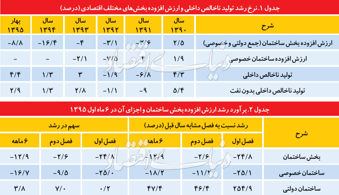 در بهار و تابستان سال 1395، رشد بخش ساختمان کماکان منفی بوده است. آمار بخش مسکن نیز جزو بخش ساختمان گزارش میشود. جدول یک آمار منتشره ازسوی بانک مرکزی و مرکز آمار در این زمینه را نشان میدهد. این آمار با قطعیت بیانگر آن است که در سالهای اخیر نرخ رشد بخش منفی است، هر چند که در سال 1395، نسبت به سال 1394، این نرخ کمتر منفی است. اگر به برآوردهای موسسه عالی آموزش و پژوهش مدیریت و برنامهریزی رجوع کنیم، درمییابیم که برآورد رشد ارزش افزوده بخش را حتی منفیتر پیشبینی کرده بود. جدول ۲ برآوردهای آن موسسه را نشان میدهد.