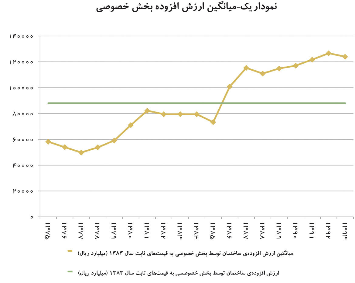 نمودار یک روند ارزش افزوده بخش مسکن را نشان میدهد. چون ارقام این نمودار به قیمتهای ثابت است، ملاحظه میشود که تحولی نامتناسب با روند گذشته از سال 85 تا 92 در حوزه مسکن (عمده ساختمان بخش خصوصی، مسکن است) رخ داده است. حتی اگر اثر وجوه ورودی به بخش از طریق مسکن مهر را نیز کنار بگذاریم، مازاد سرمایهگذاری در این بخش کاملا مشهود است؛ گویی که فعالان بسیاری از بخشهای صنعتی به حوزه ساختمان هجوم بردهاند. تقریبا همه شرکتهای بزرگ در این سالها بخشها و شرکتهای تابعهای در حوزه ساختمان فعال کردند که از رونق بخش سود برند. نمودار 2 دوباره نشان میدهد که تشکیل سرمایه ثابت ناخالص توسط بخش خصوصی در بخش مسکن از سال 1385 به بعد، ابعاد متفاوتی به خود گرفته است. پس، بیشک در دولت قبل مازاد سرمایهگذاری اتفاق افتاده است. نمودار 5 نیز نشان میدهد که بخش مسکن در سالهای 1385 تا 91 به مراتب بیش از ارقام برنامهریزی شده، مسکن تولید کرده است.