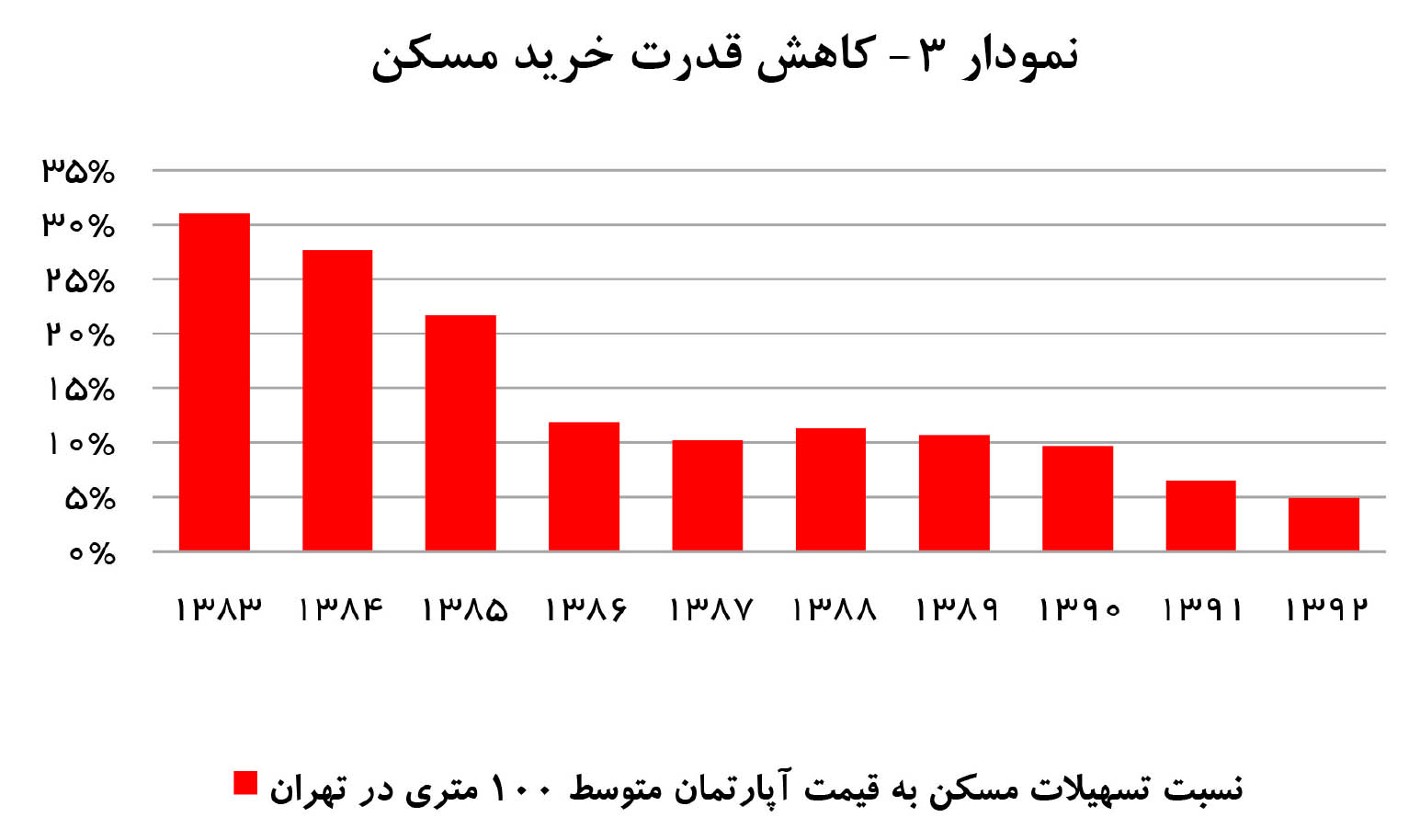 اما متاسفانه این مازاد سرمایهگذاری – اگر مسکن مهر را کنار بگذاریم که مصائب و چالشهای خود را داشته و دارد- عمدتا در حوزهای سرمایهگذاری شده که مورد تقاضای نیازمندان مسکن نبوده است. تقاضا در این دوره عمدتا سوداگرانه و با هدف کسب سود از معاملات زمین و ساختمان شکل گرفته و عرضه برای پاسخگویی به آن، در حوزه واحدهای مسکونی گرانقیمتتر و نیز واحدهای تجاری متمرکز شده است. برعکس، تقاضای مصرفی در شرایط سفتهبازانه از عرضه مناسب برخوردار نشده، چرا که به دلیل حباب قیمتی، نسبت تسهیلات خرید به قیمت واحدهای مسکونی بهشدت کاهش یافته بود. به بیان دیگر، بانکها و بهطور اخص بانک مسکن دیگر نقش چندانی در جذب پسانداز و اعطای تسهیلات خرید مسکن بازی نمیکردند. نمودار 3 نشان میدهد که از سال 84 تا 92، قدرت خرید تسهیلات مسکن به طور مداوم کاهش یافته است. بنابراین، واحد کوچک مناسب خانهاولیها به بازار عرضه نمیشد، چرا که قدرت خرید آنها در بازار موجود نبود.