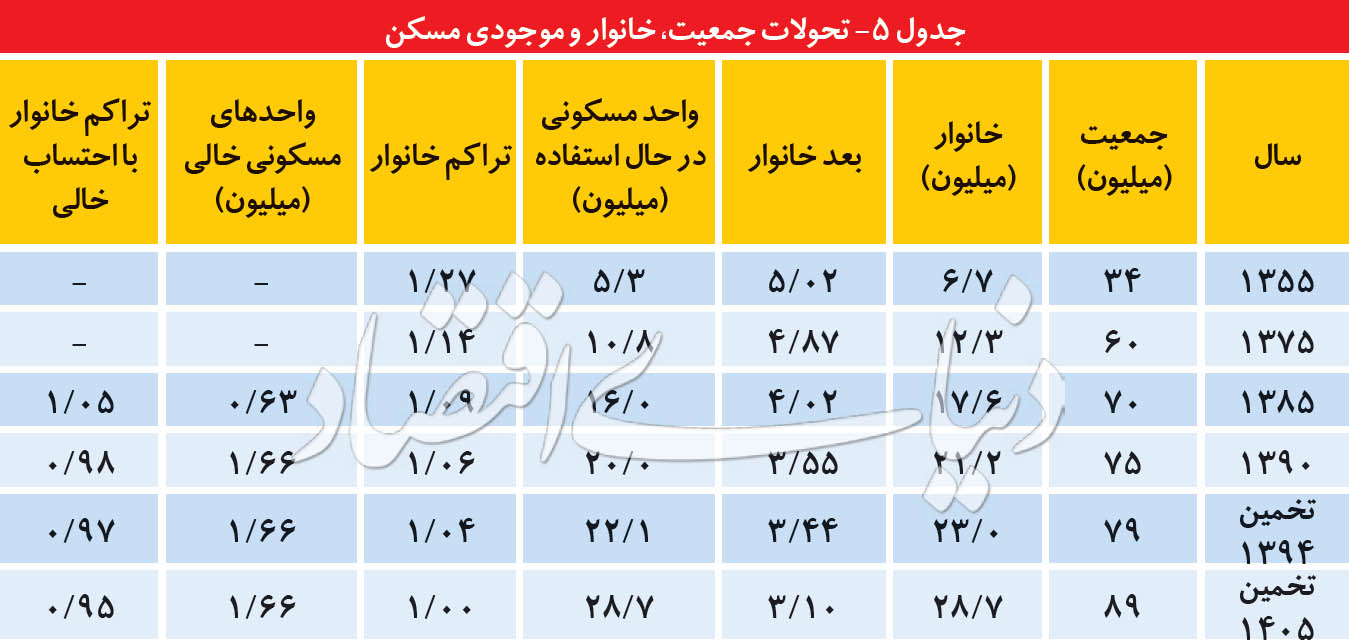 طی سالهایی که مسکن عمدتا گرانقیمت با سرعت ساخته میشد، جمعیت کشور و مهاجرت به شهرها رشد چندانی نداشته است. در واقع از دهه 70 نرخ رشد ساختوساز همواره از نرخ رشد جمعیت و خانوار پیشی گرفته است. اگر این نرخهای رشد را برای کل دوره 75 تا 1394 بگیریم، ارقام رشد برای جمعیت 1/43 درصد، برای خانوار 3/44 درصد و برای واحدهای مسکونی 3/88 درصد محاسبه میشود. بدینترتیب، کشور وارد پارادایم جدیدی شده است. جدول 5 به روشنی نشان میدهد که با ساختوسازهای فراوان نامتناسب با رشد جمعیت در سالهای اخیر، تراکم خانوار در واحد مسکونی برابر عدد یک شده و با احتساب واحدهای خالی، حتی از عدد یک نیز کوچکتر شده است.
