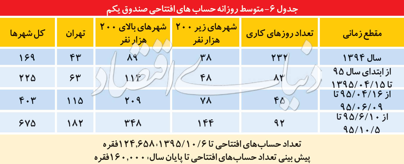 در بانک مسکن، دولت یازدهم با منابع ارزان برگشتی از مسکن مهر، نرخهای تسهیلات را برای متقاضیان قابل تحمل کرد. بدین ترتیب، افتتاح حسابهای پسانداز مسکن تشویق شد، تسهیلات جدید اعطا شد و حجم معاملات مصرفی مسکن افزایش یافت. جدول 6 متوسط روزانه حسابهای افتتاحی صندوق یکم را نشان میدهد. اکنون با سابقهای 18 ماهه، تعداد حسابهای افتتاحشده به 125 هزار فقره رسیده که به معنای اعطای قطعی وام در ماههای آینده و رونق معاملات مسکنهای مصرفی است. رشد قابلملاحظه آمار 9 ماهه تسهیلات اعطایی ساخت و خرید مسکن در سال 1395 توسط بانک مسکن نیز حاکی از موفقیت سیاستهای به کار گرفته شده است. در این 9 ماه نسبت به دوره مشابه در سال 1394، تسهیلات ساخت 100 درصد و تسهیلات خرید 81 درصد رشد داشته است. البته، نرخهای رشد متناظر از نظر تعداد کمتر و به ترتیب 58 و 26 درصد است که دلیل آن افزایش ریالی میزان وامهای اعطایی است.