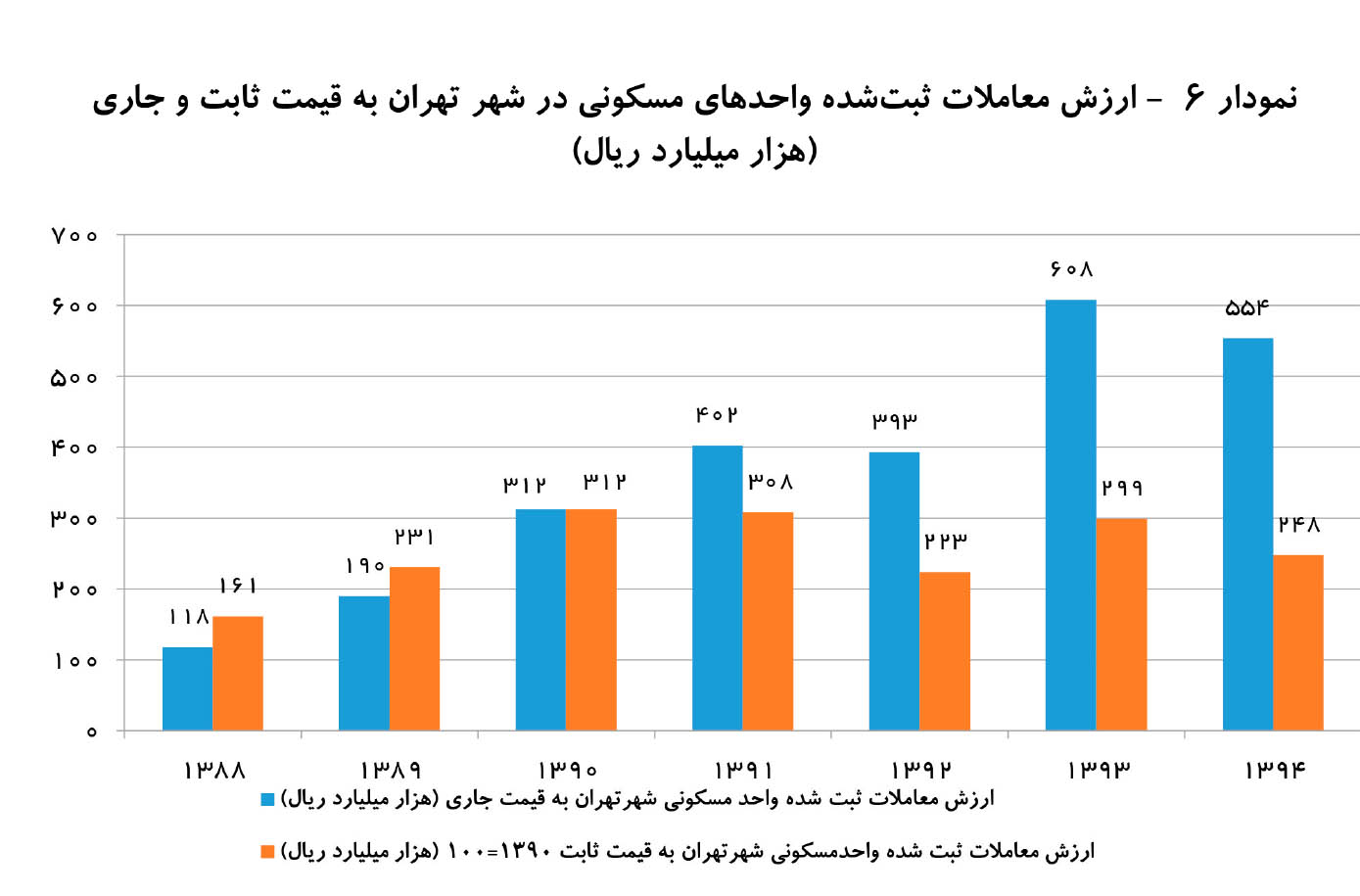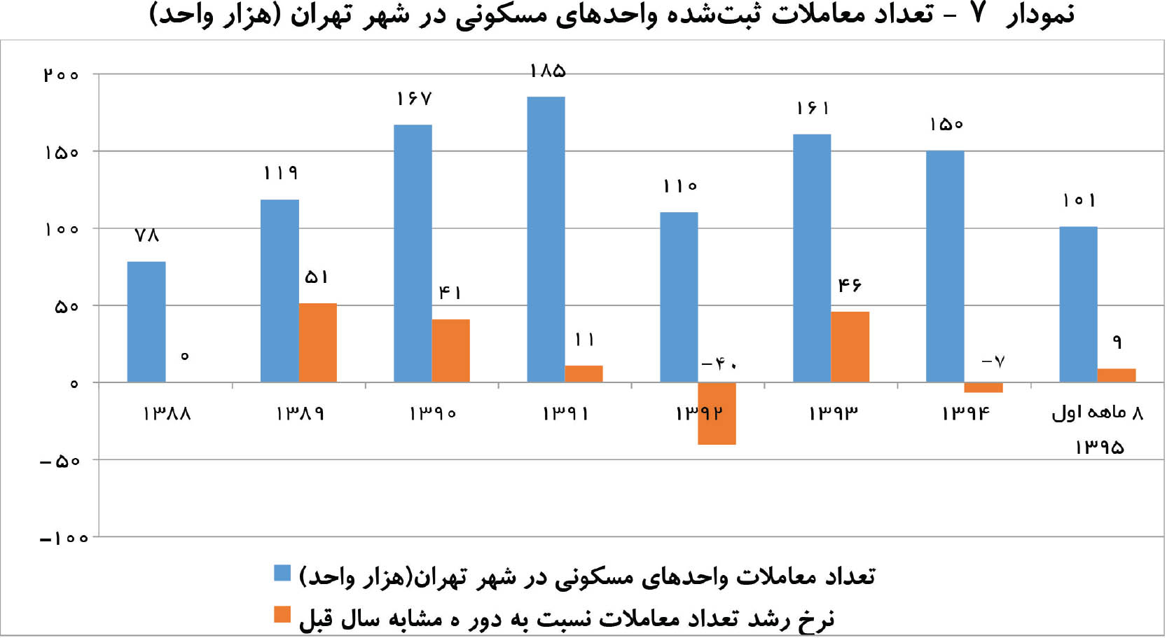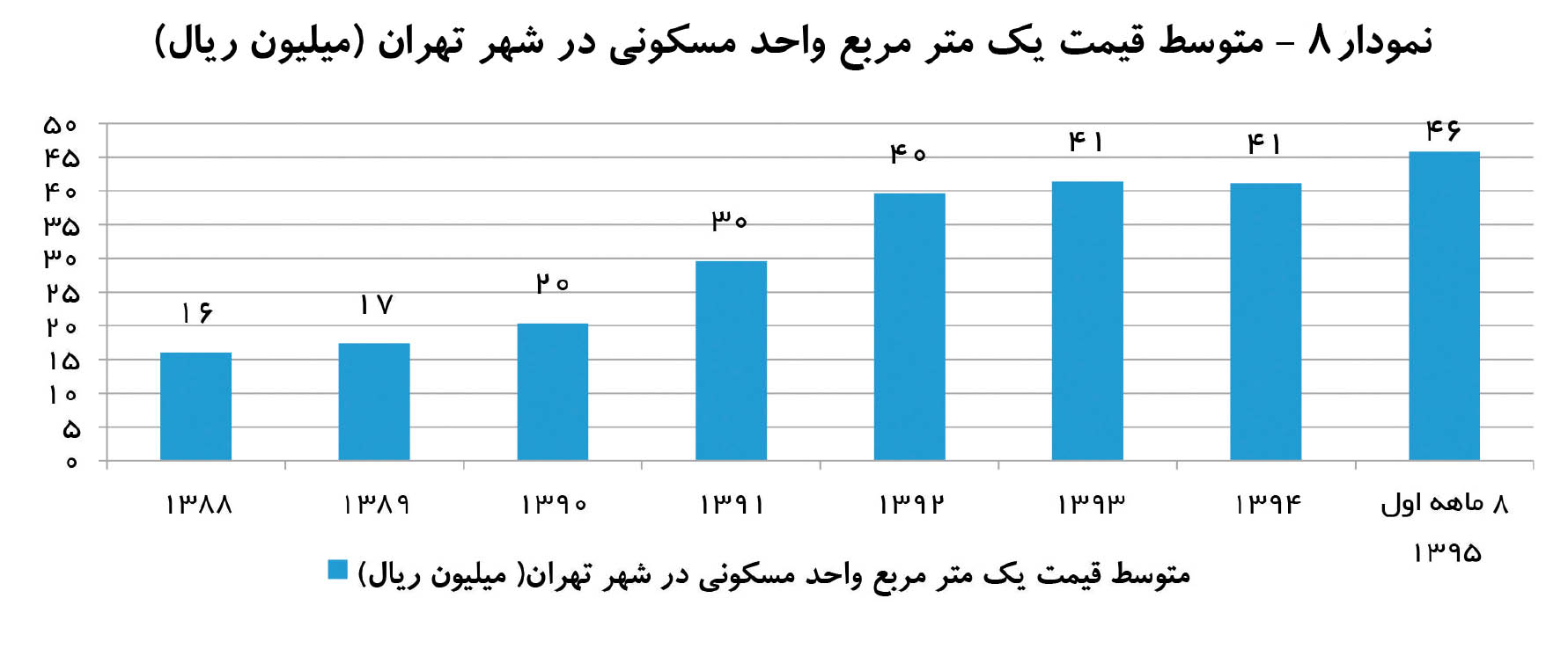 ارزش معاملات ثبتشده برای واحدهای مسکونی و تعداد معاملات در شهر تهران نمونهای از برگشتن شرایط به وضع عادی است. اگر سالهای معاملاتی 90 و 91 را کنار بگذاریم، روند معاملات سالهای اخیر بیانگر رشدی است که با رشد 0/5 درصدی جمعیت تهران همخوان است (نمودارهای 6 و 7). حتی حرکت قیمت یک مترمربع واحد مسکونی در نمونه شهر تهران نیز بیانگر تحول معقول بازار مصرفی مسکن است. (نمودار 8). افزایش قیمت در سال 1395 کموبیش با نرخ تورم جاری کشور منطبق است و این وضعیت با توجه به حجم بالای معاملات واحدهای ارزانقیمت (که در آن سهم ارزش زمین بالا نیست) بیانگر تبعیت قیمت واحدها از افزایش سطح دستمزدها و قیمت هماهنگ با نرخ تورم مصالح است. تلاش برای توقف روند منفی سرمایهگذاری در بخش ساختمان و رونق بخش مصرفی مسکن در گرو ادامه اقدام مثبتی است که برای افزایش تسهیلات خرید مسکن (بازار رهن) در بانک مسکن رخ داده و امید میرود که با کنترل تورم در سطح جاری، بتوان بهتدریج سایر بانکها را هم راغب کرد که وارد این بازار کمخطر اعتباری شوند و تسهیلات خرید مسکن بیشتری پرداخت شود.