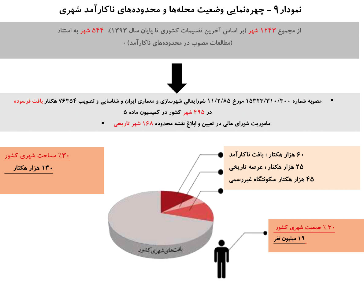 در بافتهای فرسوده شهری که در بند 2-5 و این بند از گزارش به شرح آن میپردازیم، کشور ظرفیت مناسبی برای احداث و نوسازی واحدهای مسکونی دارد. تقاضا برای ساخت واحدهای مسکونی در این مناطق موجود است. نمودار 9 بیانگر آن است که ارتقای سطح زندگی و بهبود مسکن نزدیک به 5 میلیون خانوار، با سرمایهگذاری در بافتهای فرسوده ممکن است. اصلاح وضع آن عده که موضوع بند 2-5 بودند، طبعا آسانتر است، اما تامین مسکن عمده جمعیتی که در بافتهای حاشیهای و سکونتگاههای غیررسمی زندگی میکنند، در گروه «مسکن اجتماعی» قرار میگیرد و نیازمند بودجههای عمومی است. مازاد سرمایهگذاری و ساخت در کلانشهرها و خانههای خالی شهرهای بزرگ مساله آنان را حل نمیکند. موضوع این افراد در واقع به بازار مرتبط نیست. راهحل به میزان حمایتی بستگی دارد که بتوان از طریق بودجه عمومی و وجوه تامین اجتماعی برای آنان تجهیز و فعال کرد.
