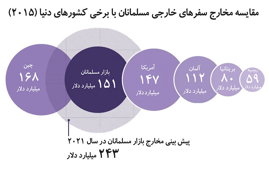 طبق آماری که آخرین گزارش «وضعیت اقتصاد اسلامی جهان» منتشر کرده است، در سال 2015 مخارجی که مسلمانان در سفرهای برون مرزی خود انجام میدهند و در این گزارش با عنوان اندازه بازار گردشگری حلال ذکر شده، با افزایش 9 میلیارد دلاری نسبت به سال 2014 به 151 میلیارد دلار رسیده است. در مقام مقایسه، چینیها 168 میلیارد دلار، ایالاتمتحده آمریکا 147 میلیارد دلار، آلمان 112 میلیارد دلار، بریتانیا 80 میلیارد دلار و روسیه 59 میلیارد دلار صرف سفرهای خارجی خود میکنند. این مقایسه نشاندهنده پتانسیلهای موجود بازار گردشگری مسافران مسلمان است که 2/ 11 درصد از مخارج جهانی سفر را تشکیل میدهد. در سال 2015 بازار مخارج سفرهای مسلمانان موفق شده است آمریکا را پشتسر بگذارد و اکنون پس از چین بزرگترین سهم در مخارج سفرها را در اختیار داشته باشد. در گزارش پیشین این سازمان که منعکس کننده آمار سال 2014 بود، چین و آمریکا بالاتر از بازار گردشگری مسلمانان قرار داشتند. علاوهبر این، برآورد میشود درآمدهای بهدست آمده که به نوعی در جهت برآوردن نیازهای گردشگری مسلمانان باشد، در سال 2015 به 24 میلیارد دلار رسیده باشد.