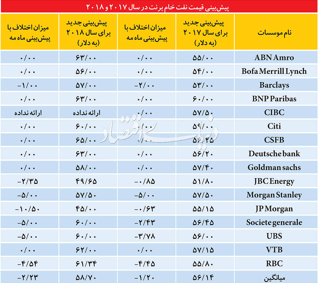 همچنین برای پیشبینی قیمت هر بشکه نفت خام برنت در سال 2018، هشت موسسه نظر خود را تغییر ندادهاند و یک موسسه نیز بدون نظر بوده است. اما بیشترین تغییر نظر برای قیمت هر بشکه نفت خام برنت در سال 2018، نسبت به ماه گذشته میلادی مربوط به موسسه جی پی مورگان بوده که افت 50/ 10 دلاری را برای این نفت پیشبینی کرده است. همچنین افت یک دلار بر بشکه، کمترین تغییر قیمتی برای نفت خام برنت در سال آینده میلادی از سوی موسسه بارکلیز بوده است.اما در مجموع، نظرسنجی این ماه برای قیمت هر بشکه نفت خام برنت در سال آینده میلادی به شکل میانگین روی عدد 70/ 58دلار بر بشکه قرار گرفته است. به این ترتیب میتوان مشاهده کرد با وجود اینکه هیچکدام از این 16 موسسه پیشبینی رشد قیمت را برای نفت خام برنت در سال جاری و سال آینده میلادی نداشتهاند، قیمت این نفت همچنان در کانال 50دلاری قرار دارد که نشان از نوعی خوشبینی شکننده به بازار نفت دارد.
