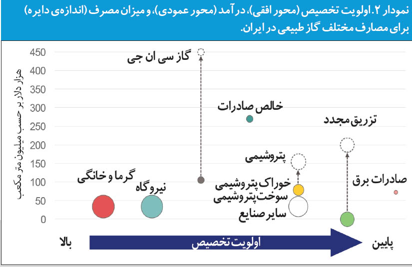 این در حالی است که تبدیل نیروگاههای گازی فعلی به سیکلترکیبی و نوسازی نیروگاههای بخاری، امکان اضافه کردن حدود ۱۰ گیگاوات ظرفیت با هزینه سرشکن شده کمتر از یک سنت بر کیلووات ساعت را فراهم میسازد. همچنین بررسی صورتگرفته نشان میدهد که تولید برق تجدیدپذیر در اقلیم ایران از طریق پروژههای بزرگمقیاس خورشیدی و بادی با فرض تامین مالی دولتی، هزینهای حدود ۴ سنت بر کیلووات ساعت دربر خواهد داشت. تقبل چنین هزینهای تنها با اطمینان از حصول ارزشافزودهای بیش از ۱۵۰ هزار دلار به ازای هر میلیون مترمکعب گاز صرفهجویی شده توجیهپذیر است. در حالحاضر استفاده از گاز طبیعی در بخش حمل ونقل، صادرات، (و با قطعیت کمتر) تزریق مجدد به میادین نفتی بهطور بالقوه توانایی تحقق شرط فوق را دارا میباشند.